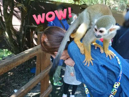 ここにはいろんなお種類のおさるさんや、カピバラ、ヤギにヒツジ、ミーヤキャットやキリンにシマウマ、カバなどたくさんの動物がいて、ほとんどの動物に餌やりができ、触れ合うことはできます。その中でも特に触れ合ったのはリスザル!!とっても活発!!!餌を待ちきれず飛び乗ってきては、餌はもちろん、それ以外の持ち物に興味津々♪人か人へと軽々飛び乗っては餌をもらっていました!(^^)!